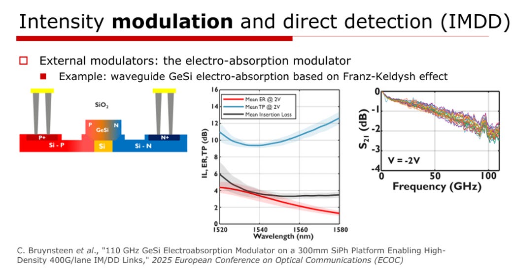 Electro-absorption modulator - These are modulators that act like direct “switches”. They consist of PIN diodes that are embedded within the waveguide the optical signal goes through. The idea is that the PIN diode bandgap moves with applied voltage and affects the optical absorption.