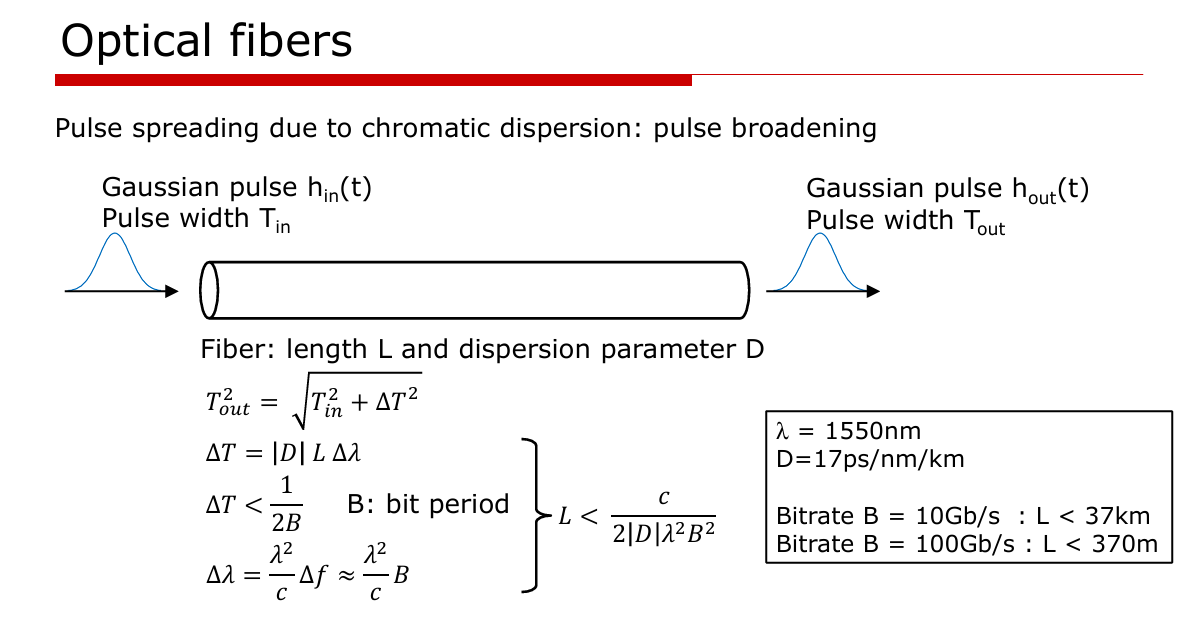 Chromatic Dispersion - pulse spreading after propagation over the fiber. This is caused by fiber refractive index dependence on wavelength