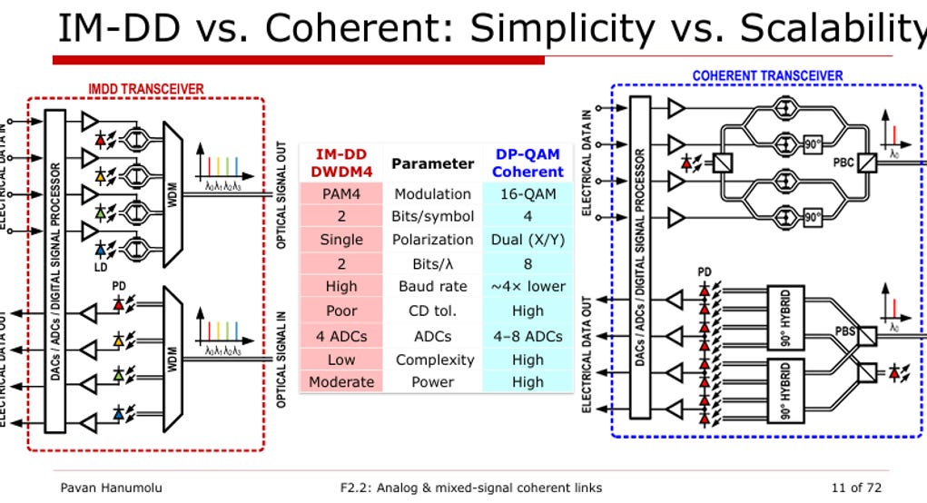 This brings us to the last topic, Coherent Optical, that I’ll briefly cover. Coherent optical transceivers encodes both amplitude and phase in the optical field, often with two polarizations, and recovers it using a local oscillator and DSP.