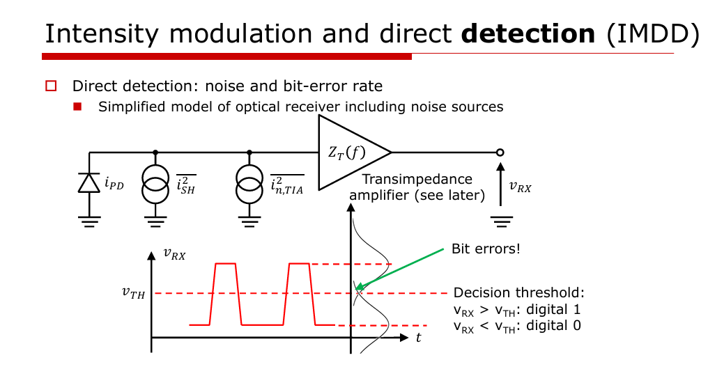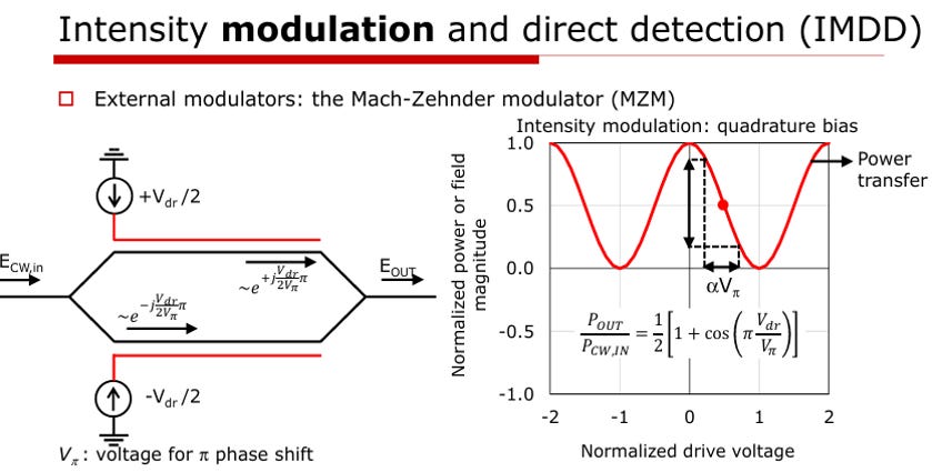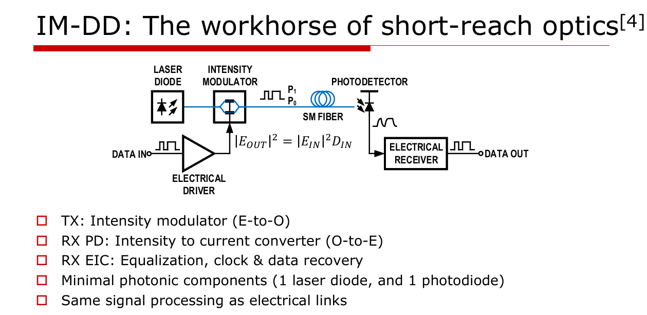 IM-DD is the workhorse of short reach optics. IM-DD encodes information in optical intensity (whether that be 0/1 or higher levels in PAM4) and recovers it through direct detection.