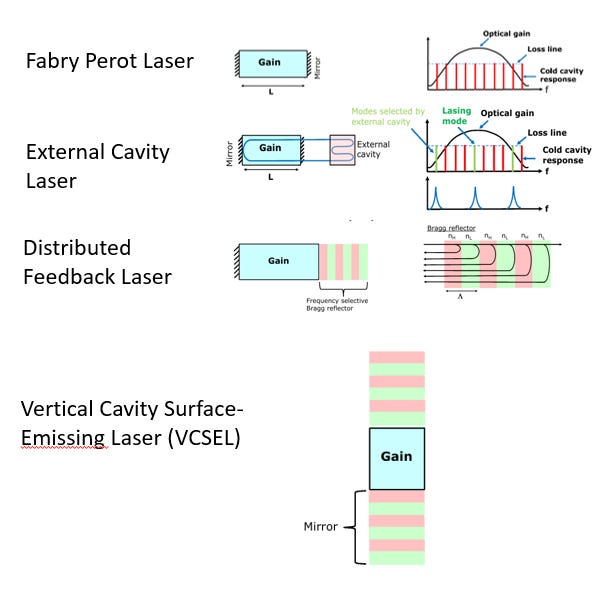 Then, either a cavity structure or frequency selective bragg reflectors selects which optical modes are sustained.