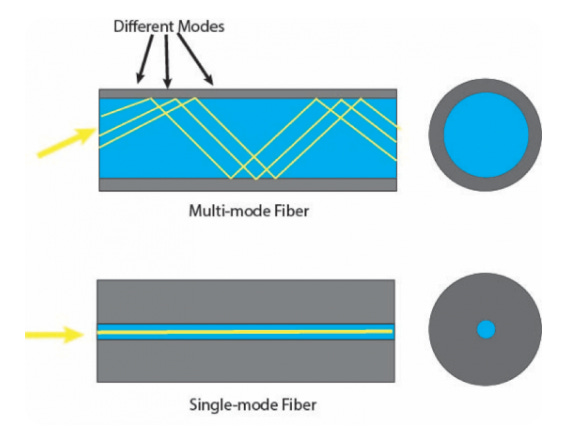 Single Mode - Uses a smaller core (8-10um) to transmit a single mode of light