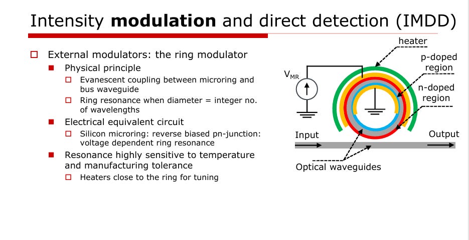Ring Modulator - the idea is that a micro-ring is placed next to a bus waveguide with evanescent coupling in between. The signal resonates inside of the ring when the diameter equals the integer number of wavelengths.