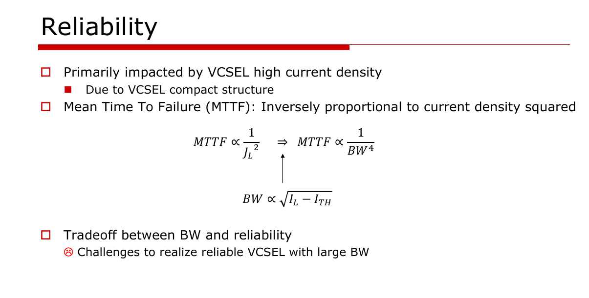 The main tradeoff in VCSELs is between BW and reliability. Higher current densities allow for higher BWs, but it also decreases the mean time to failure, a common metric used when evaluating reliability.