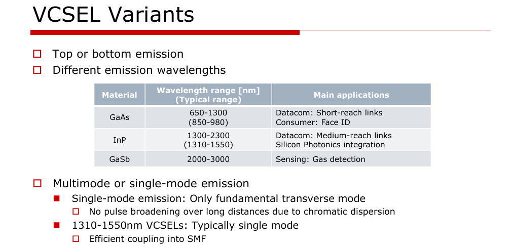 850 nm GaAs VCSELs are common for short-reach multimode links.