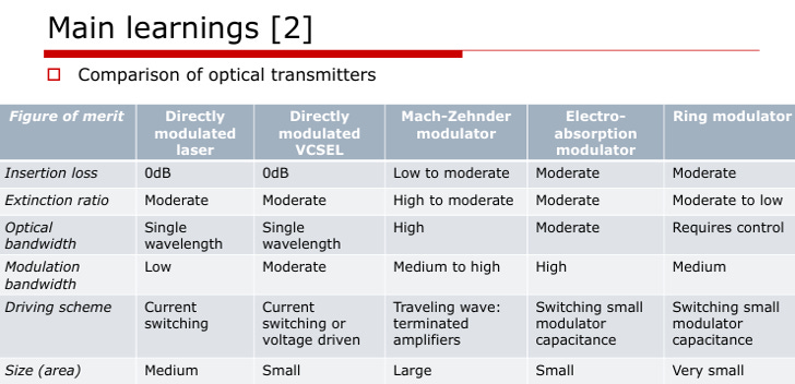 A comparison of all of these modulator schemes is shown in the above table. As you can see, external modulators tend to have much higher modulation and optical bandwidths, but impose insertion loss and size penalties in some cases.