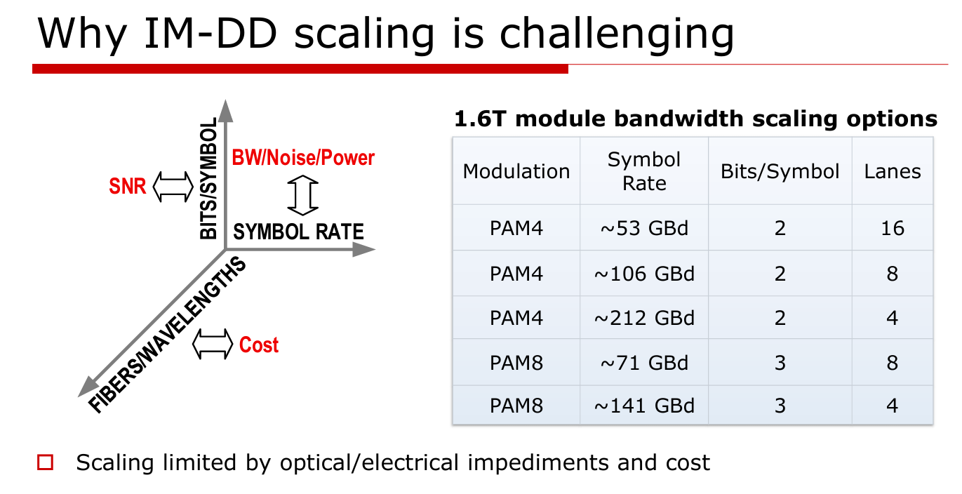 Scaling IM-DD to higher data throughputs is hard due to several unfavorable tradeoffs between BW, reach, noise, power, SNR, and cost. These include effects in both optical and electrical domain themselves: