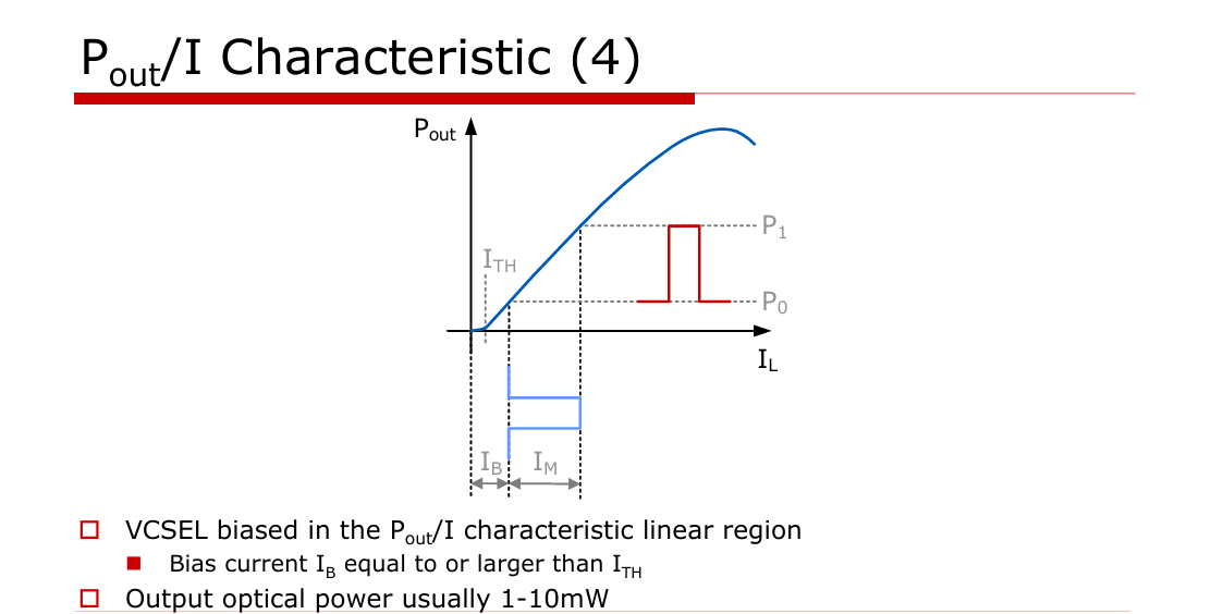 The Pout/I of VCSELs almost resembles a linear diode. The VCSEL begins lasing above a particular threshold current and exhibit a linear relationship between Pout / Iin over a useful operating region. Lasers require a DC bias to set the device in the linear region.