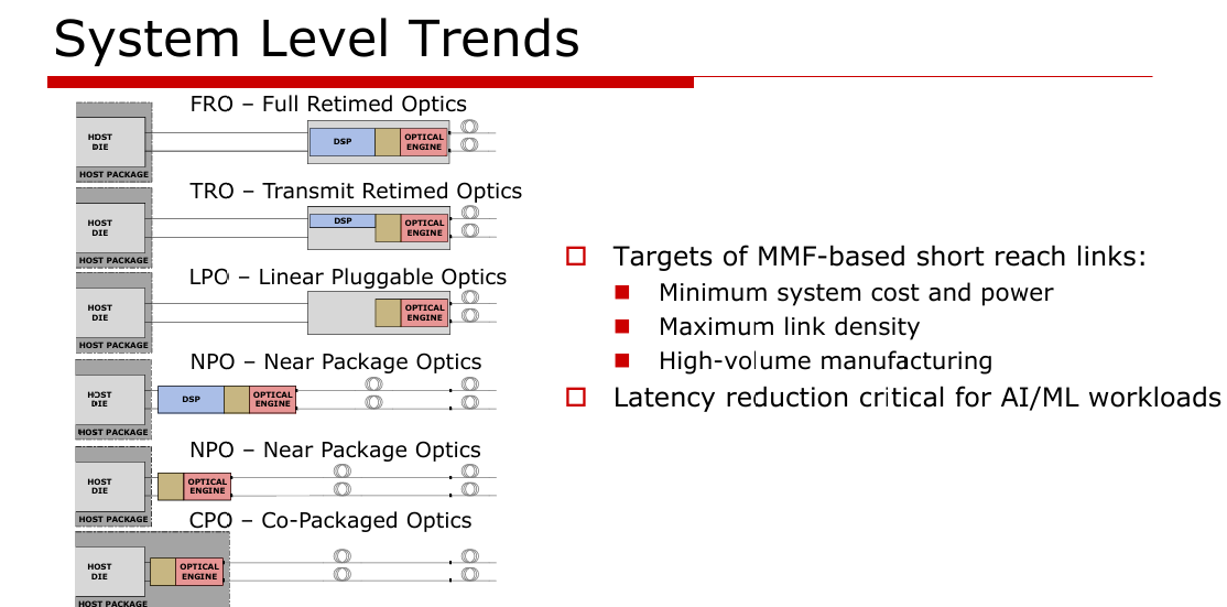 Then, in NPO, the optical components themselves are custom placed close to the package. This shortens the distance between the host die and the optics itself and enabled greater speed scaling. However, it does require much tighter integration within the system.