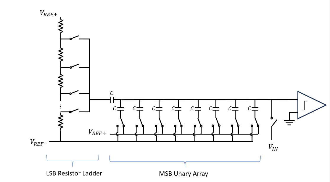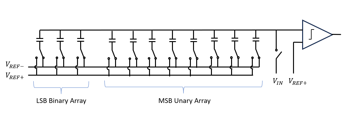 MSBs are Unary / Thermometer code: Encode the MSBs using unary code which uses unit sized capacitor values. These capacitors tend to be “arrayed” in 2D especially as resolution increases.