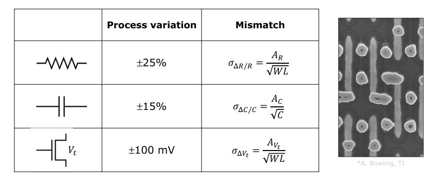Matching. Perhaps the number one culprit of nonlinearity is the variability of components. Mismatch standard deviation generally improves roughly with the inverse square root of device area, depending on the parameter and model.