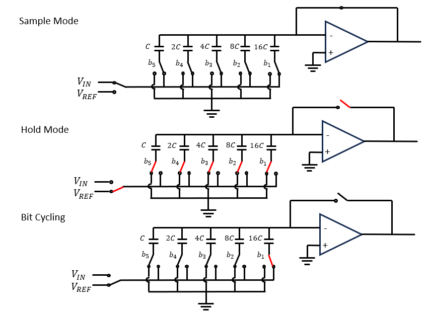Here, the capacitors are binary weighted. There are three phases of operation: