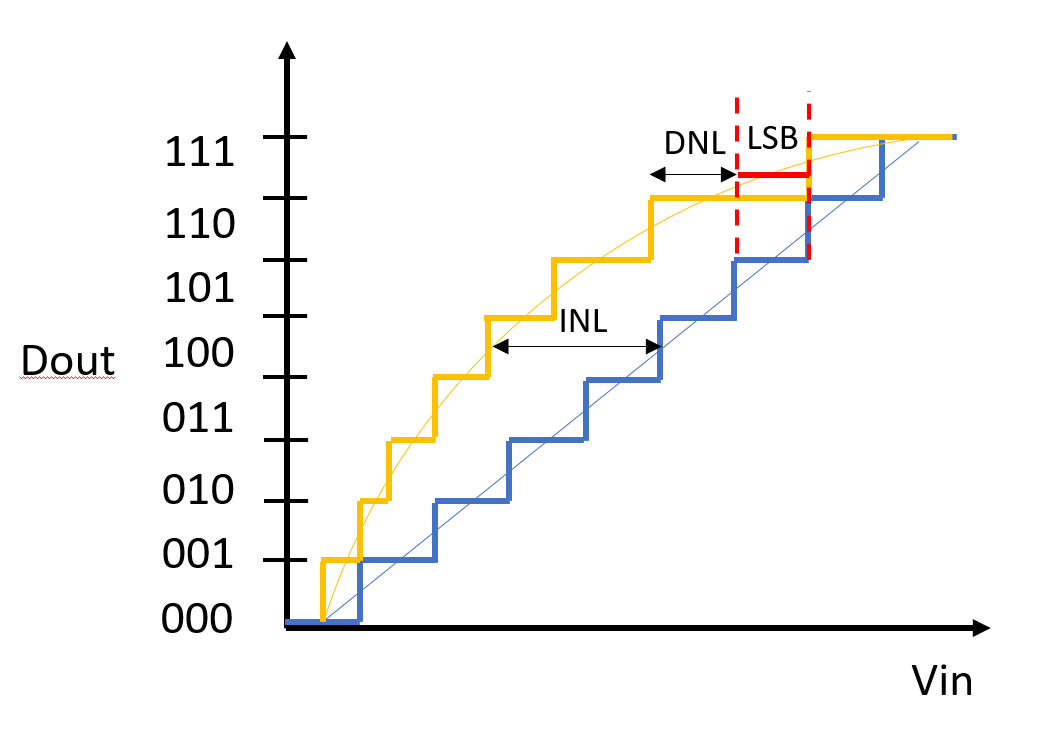 Differential Nonlinearity error (DNL). DNL describes the deviation of each step with respect to the ideal LSB size