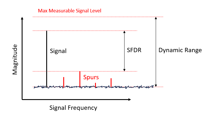 Spurious free dynamic range (SFDR). SFDR measures the difference between the fundamental signal and the largest unwanted single unwanted component. It accounts for the spurs that typically comprise a spectrum.