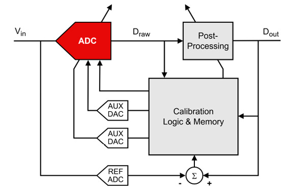 Calibration can utilize reference and auxiliary ADCs/DACs to be able to “measure” the raw Dout and correct for it. Calibration can be done in the analog domain or digital domain by pre-distorting the Din to have it align to the nonlinear characteristic of the ADC.