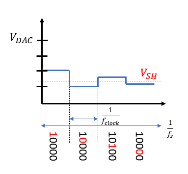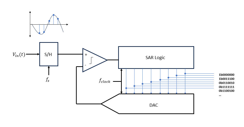 SAR ADCs use the “binary search algorithm” in order to figure out the right digital code that minimizes the error between the voltage input and the DAC output.